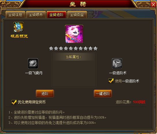 3、 坐骑进阶有一定几率失败,进阶失败,会增加祝福值,祝福值满时进阶概率会自动提升为;