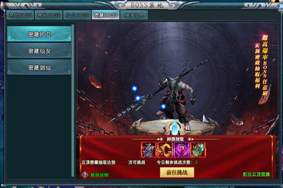 禁地BOSS新增密藏BOSS分页,参与云顶密藏抽奖达到一定次数后可以参与BOSS挑战