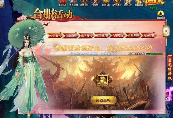 BOSS好礼:合服活动的前3天,神级BOSS,禁地BOSS,圣域BOSS,仙位BOSS掉落道具额外增加50%