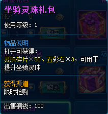坐骑灵珠礼包半价出售,只需要150元宝,限购20个。打开可获得:灵珠碎片×50、五彩石×3。