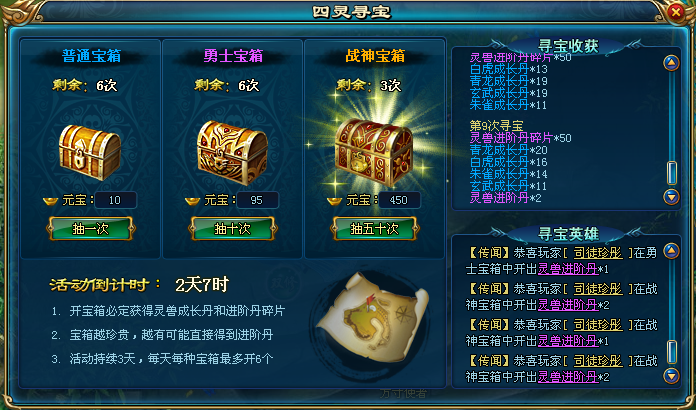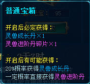 达到等级=35级开启四灵玩法后,即可开启四灵宝箱活动。参与四灵宝箱活动,可以获得灵兽成长丹和灵兽进阶碎片哦。