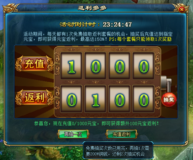 每次抽奖随机抽中一个返利套餐,抽中之后(抽中之前不算噢)充值达到指定额度即可获得对应的元宝返利。