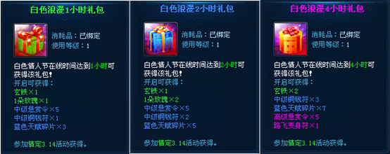 【活动内容】:一年浪漫的白色情人节如期将至,每日登陆仙侠傲世,在线时间换丰富礼包!