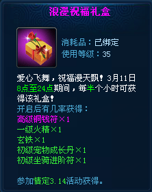 【活动内容】:3月11日8:00-24:00期间,游戏内每半个小时可以看见“爱心满天飘”的盛典,并且可以领取浪漫祝福礼盒。开启礼盒可获得随机道具。