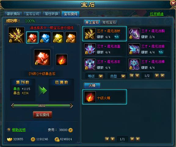 1)使用火精可提升宝石的纯度,纯度达到每一阶的上限即可升阶,升阶可获得大量属性提升