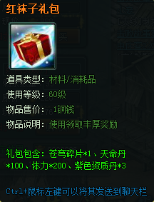 【红袜子礼包】 | 苍穹碎片*1、天命丹*100、体力*200、紫色资质丹*3 | 888 |