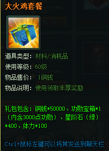 【大火鸡套餐】 | 铜钱*50000、三千功勋宝箱*1(内含3000点功勋)、绿色星阶石*400、体力*100 | 588 |