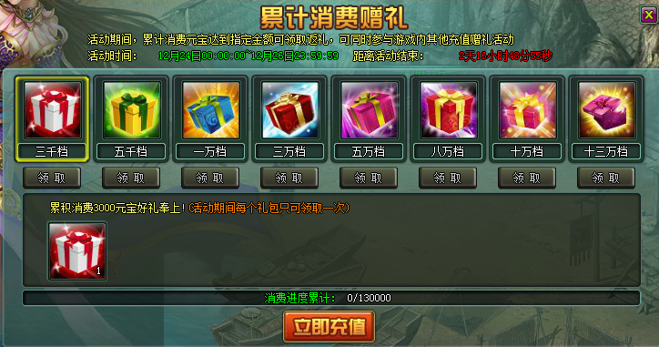 130000(元宝) | 套装卷轴宝箱*16、金韵贡墨*60、浴火重生宝箱*10、体力1000 |