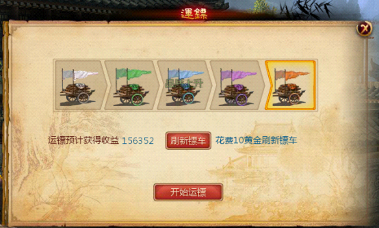 选择镖车时,可花费20金币刷新镖车品质,并有较大几率提升1-2个品阶;