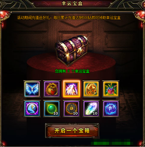 【活动内容】活动期间,累积充值500钻即可获得一个幸运宝盒。奖励内容挑战,样样值得拥有!