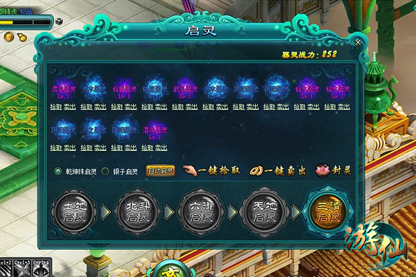 启灵的操作十分简单,点击游戏界面下方的“器灵”按钮,打开启灵界面,在界面左下方选择是通过乾坤珠还是银子来进行启灵,之后点击“自动启灵”,系统便可以帮你完成所有操作了,所获得的器灵都将在界面上显示出来。当乾坤珠或银子不足以开启下一步启灵,或者获得的器灵已经充满了启灵界面的时候,便会自动停止。你可以通过一键拾取将器灵收到封灵包中,或者分别点击各个器灵下方的拾取按钮,有选择的将其收纳于包中。而“一键卖出”则可以帮你把废灵一口气都卖掉。同时,你也可以通过点击界面中亮起的圆形的五个启灵方式按钮来进行启灵操作。