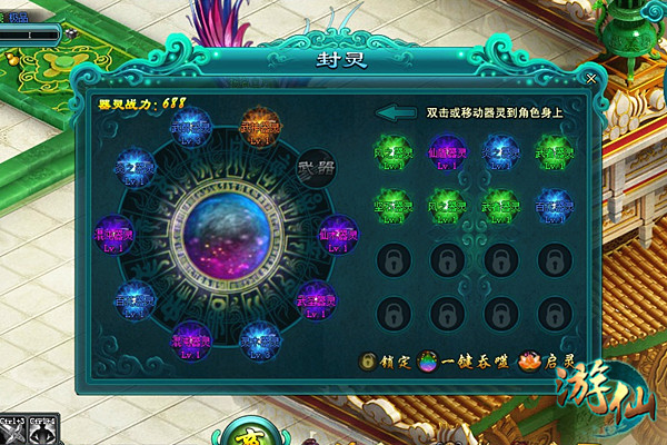 获得了自己满意品质的器灵之后,便可以点击启灵界面右侧的“封灵”按钮进入封灵界面。你可以双击右侧封灵包中的器灵,来让其自动镶嵌到指定的位置中。另外,当包中的器灵都为同一个颜色品质时,个空格的器灵默认为“主器灵”,你还可以点击界面下方的“一键吞噬”,让主器灵吞噬掉其他的器灵获得经验而成为更高等级的器灵。如果包中的器灵品质不同,一键吞噬则会令高品质的器灵吞噬掉所有其他低品质的器灵。之后再镶嵌进左侧的空格位中,就大功告成啦。