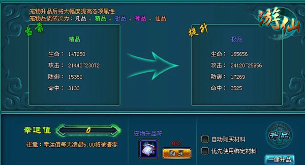 宠物的品阶也是分为5个等级、可以大幅增加宠物和人物的战力。分别为:凡品、精品、、神品和仙品(可以通过宠物升品符来进行提升)。