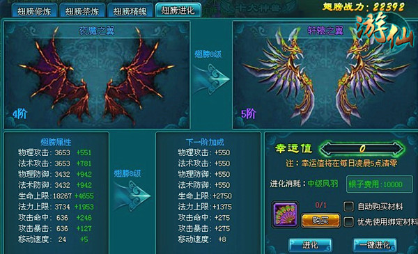 翅膀可以通过凤羽来提升品阶,还可以通过各种圣灵露和仙灵露来增加等级,也可以通过乾坤珠来增加等级(乾坤珠可以通过在线时间获得每3分钟获得一颗,圣灵露和仙灵露可以通过副本和BOSS获得)。可以用玄武精魄、朱雀精魄、白虎精魄、青龙精魄、神兽精魄来增加属性和战力(合成4神兽精魄的材料可以通过各等级的野怪获得)。
