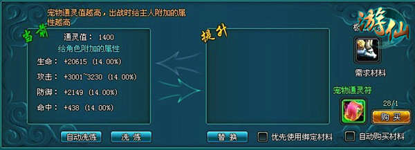 当然在大家进入游仙进行各种探索时,陪伴你的宠物是必不可少的,同样宠物也会为你增加很多的战力。宠物可以通过灵兽蛋来升级来提升属性,也可以通过炼骨、洗炼、升品来提升战力(灵兽蛋、宠物炼骨符和洗炼符可以通过各种副本和BOSS获得)。