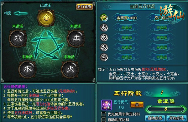 五行虽然表面增加的战力少但是却是PK必不可少的。五行是通过五种属性的相互克制来对对手造成忽视防御的伤害,每增加一种五行可以增加固定伤害,对于克制的五行属性可以造成多倍固定伤害。同时五行副本也可以通过消灭各种五行属性的怪物来获得各种道具以提升其他方面的战力。
