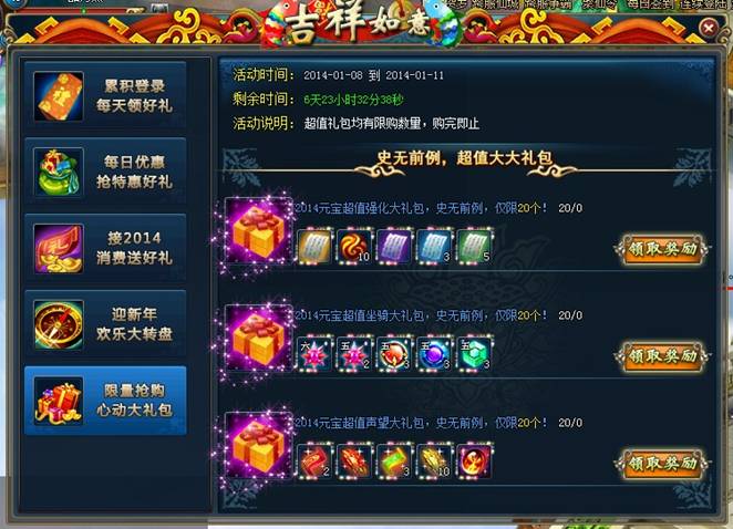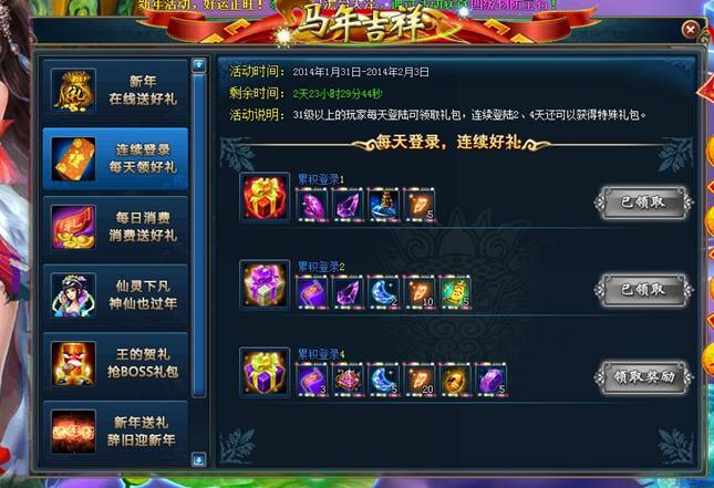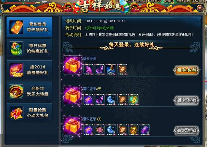 活动说明:活动期间内,31级以上玩家每天登陆可以领取礼包,累积登陆2天和4天可以获得特殊礼包!
