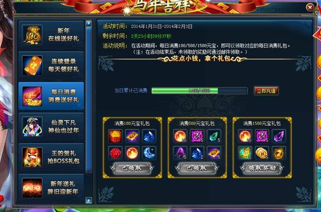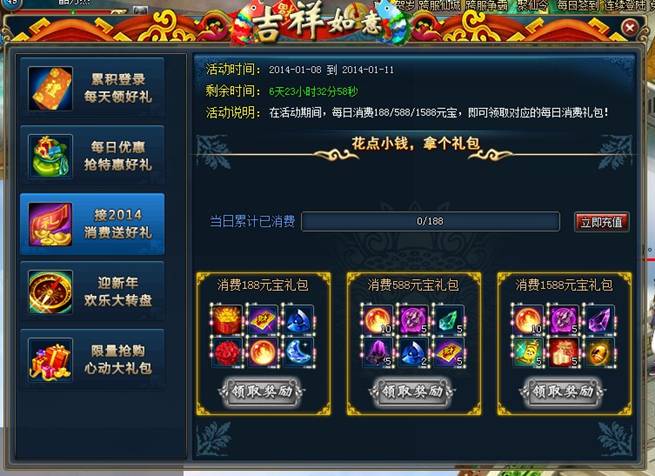 活动介绍:活动期间内,每日消费188元宝、588元宝、1588元宝就能领取对应的超值礼包,活动结束后,未领取的礼包会通过邮件进行发送~