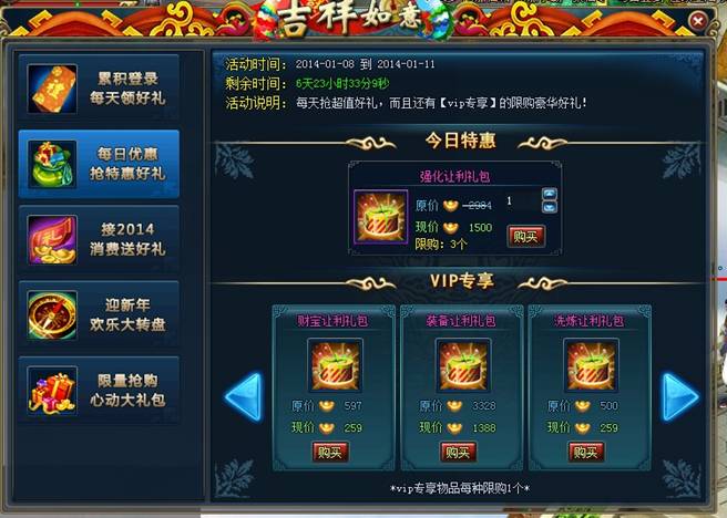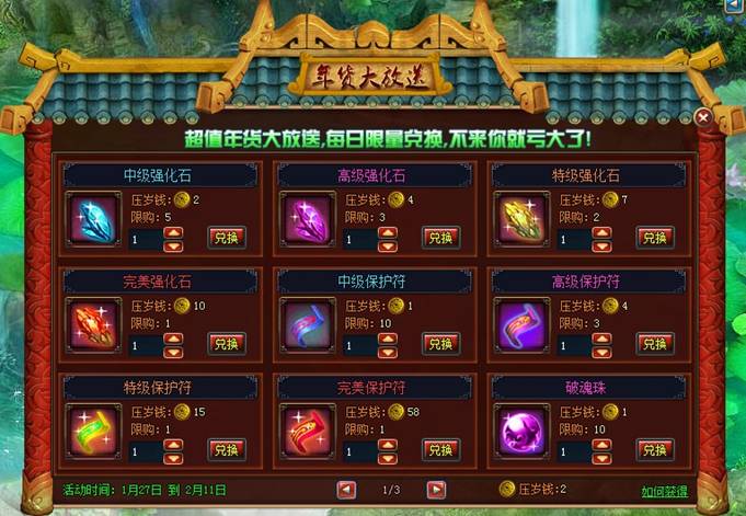 活动介绍:玩家可以通过打新年世界boss、参加其他新年活动获得压岁钱,获得的压岁钱可以在年货大放送中兑换想要的超值特惠珍品。