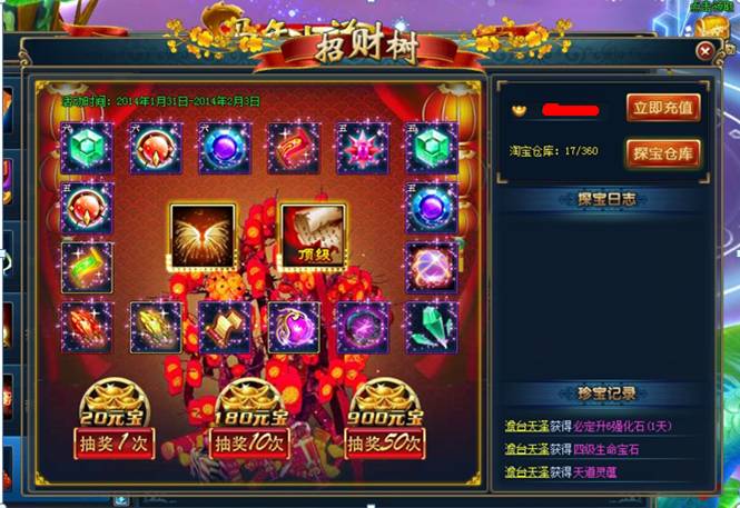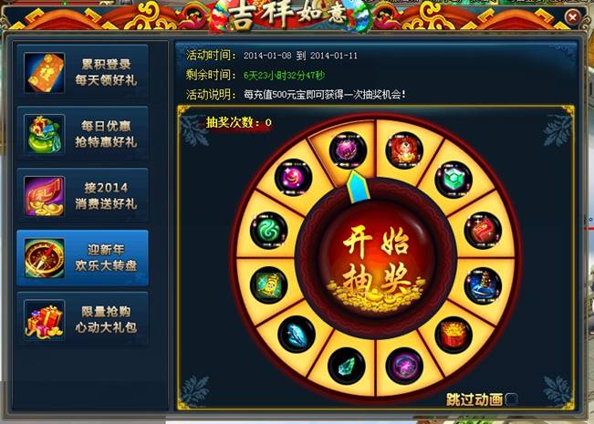 活动介绍:新年欢乐大转盘,送财童子、恋爱猫坐骑祝御天玩家财源广进,喜事天天有!