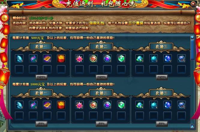活动介绍:充值达到一定额度可以选择一个礼包领取哦,这么多给力的礼包,总有一个是你喜欢的!
