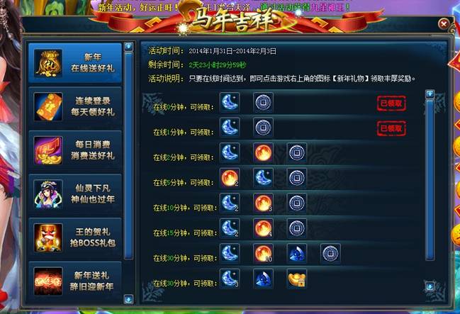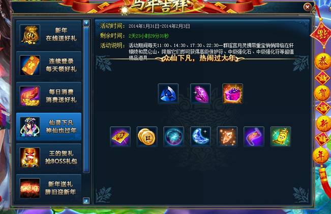 活动介绍:活动期间内,玩家斩仙达到条件即可领取丰厚的新年礼物。