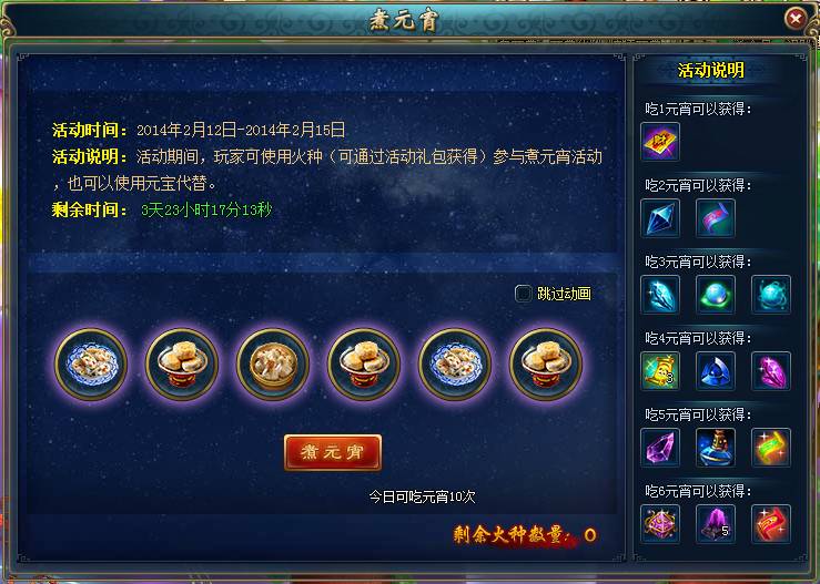 活动说明:活动期间,玩家可使用火种参与煮元宵活动,也可使用元宝代替。