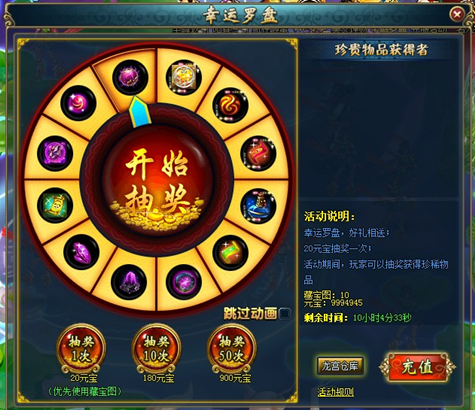 【活动内容】:活动期间,玩家可使用20元宝进行一次幸运抽奖,也可以使用藏宝图进行抽奖;超级奖励首次惊现!