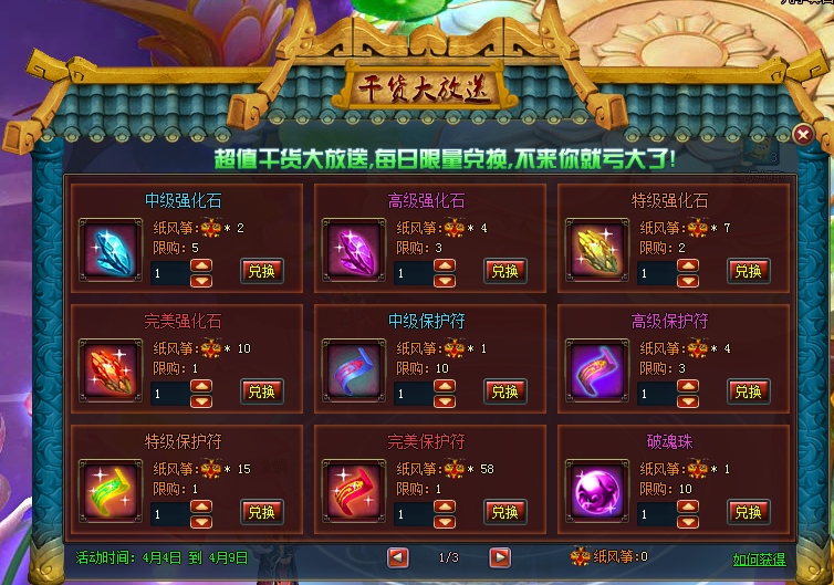 活动内容:活动期间内,参与其他活动可获得活动兑换道具,活动道具可在干货大放送界面兑换珍稀道具。