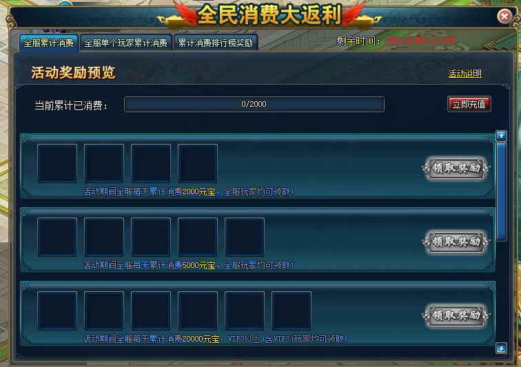 【活动内容】:活动期间,全服每天累计消费元宝数量达到一定额度,全服玩家都能领奖!VIP还有额外福利哦~