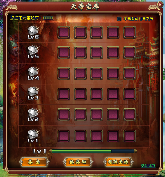 【活动内容】:活动期间,来自远古的天帝宝库首次开启,花费相应元宝参与鉴宝即可获得天帝宝库里面的超值珍品,奖励呈阶梯递式增长,等级越高,奖励也随之越丰富超值,任选的哦亲!别犹豫了,走起!