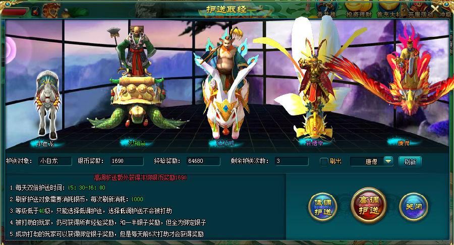 玩家角色达到33级之后就可以在紫霞仙子接取护送取经任务,护送成功之后会获得大量经验和金钱奖励。选择护送的NPC不同获得的奖励也不同。每日完成次数上限3次。建议在双倍活动时间内进行,可以获得双倍收益呦。