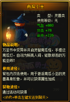 活动说明:活动期间,开启南瓜宝藏活动,玩家可以探宝获得大量稀有道具以及活动道具。更有几率获得可合成万圣节专属灵兽-南瓜小巫 所需的合成道具“南瓜灯”。