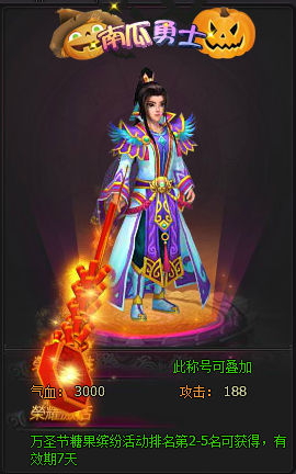 活动说明:活动期间,万圣节不给糖就捣乱,请各位仙将收集万圣糖果喂食南瓜怪,点亮南瓜灯。每点亮一个南瓜灯可额外获得专属礼包奖励。活动结束时,喂食糖果个数排名前五的玩家分别可获得万圣节专属称号奖励。